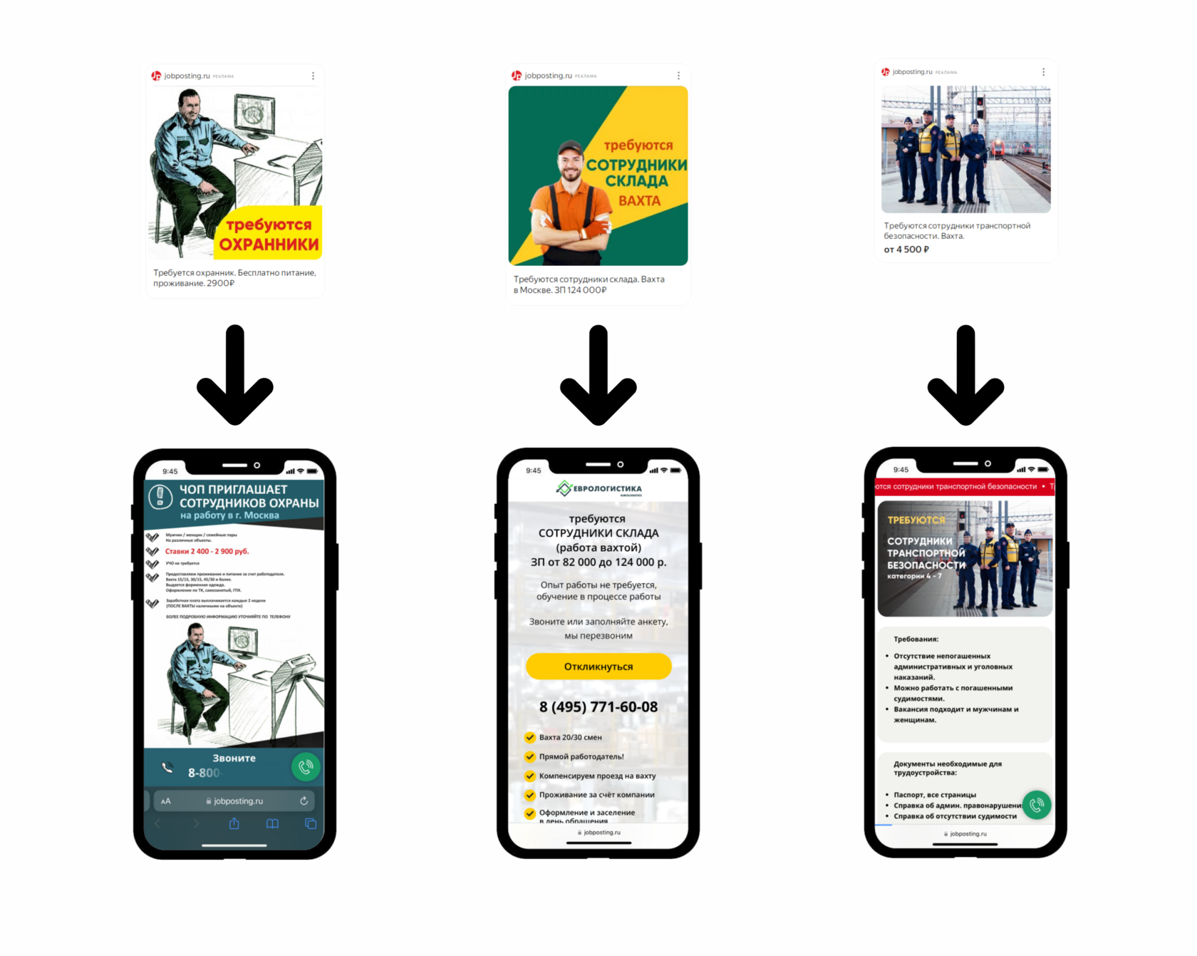 Создание посадочной страницыДля начала мы создали посадочную страницу с вакансией, адаптивная верстка страницы обеспечила корректное отображение на всех типах экранов смартфонов.